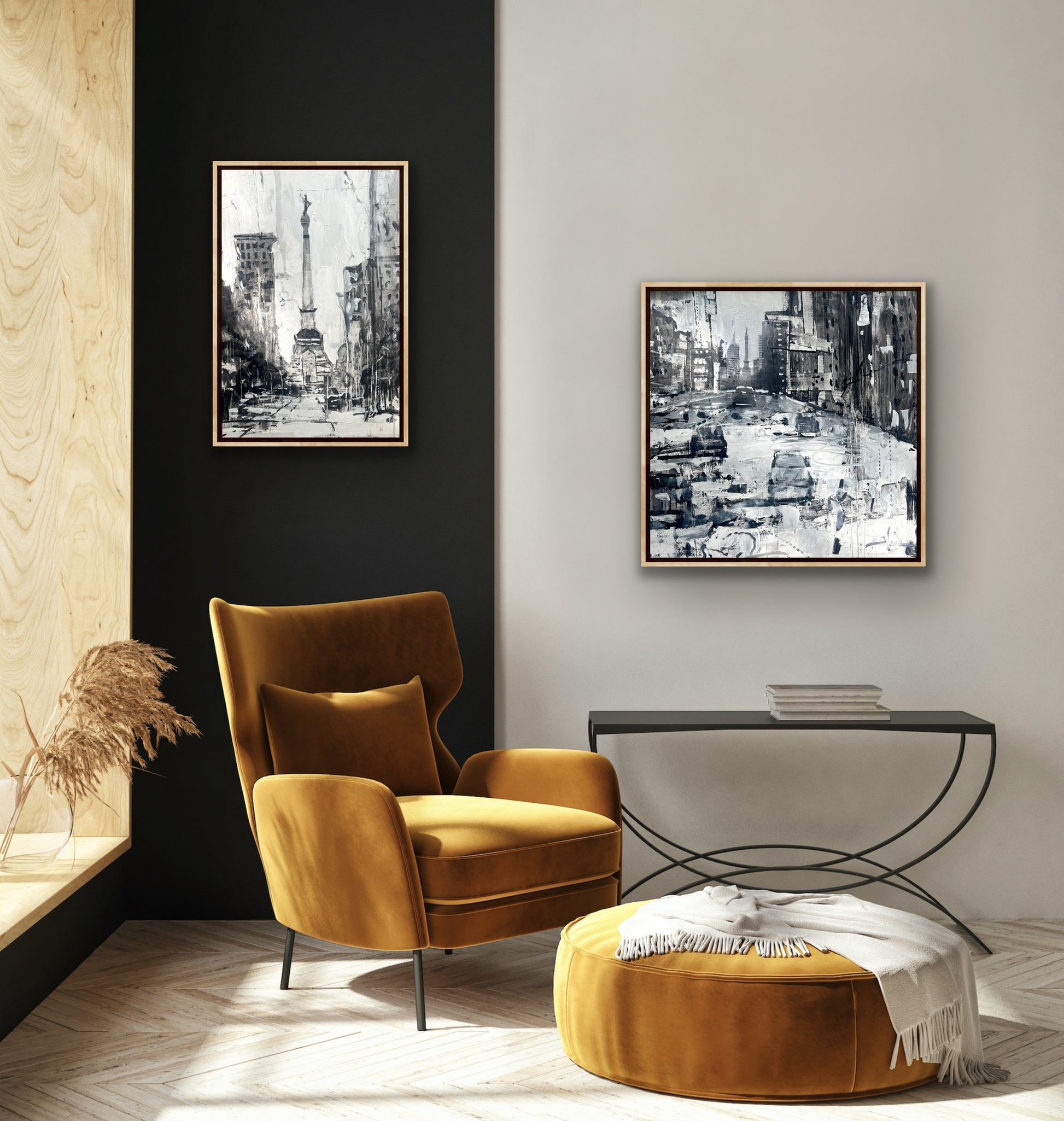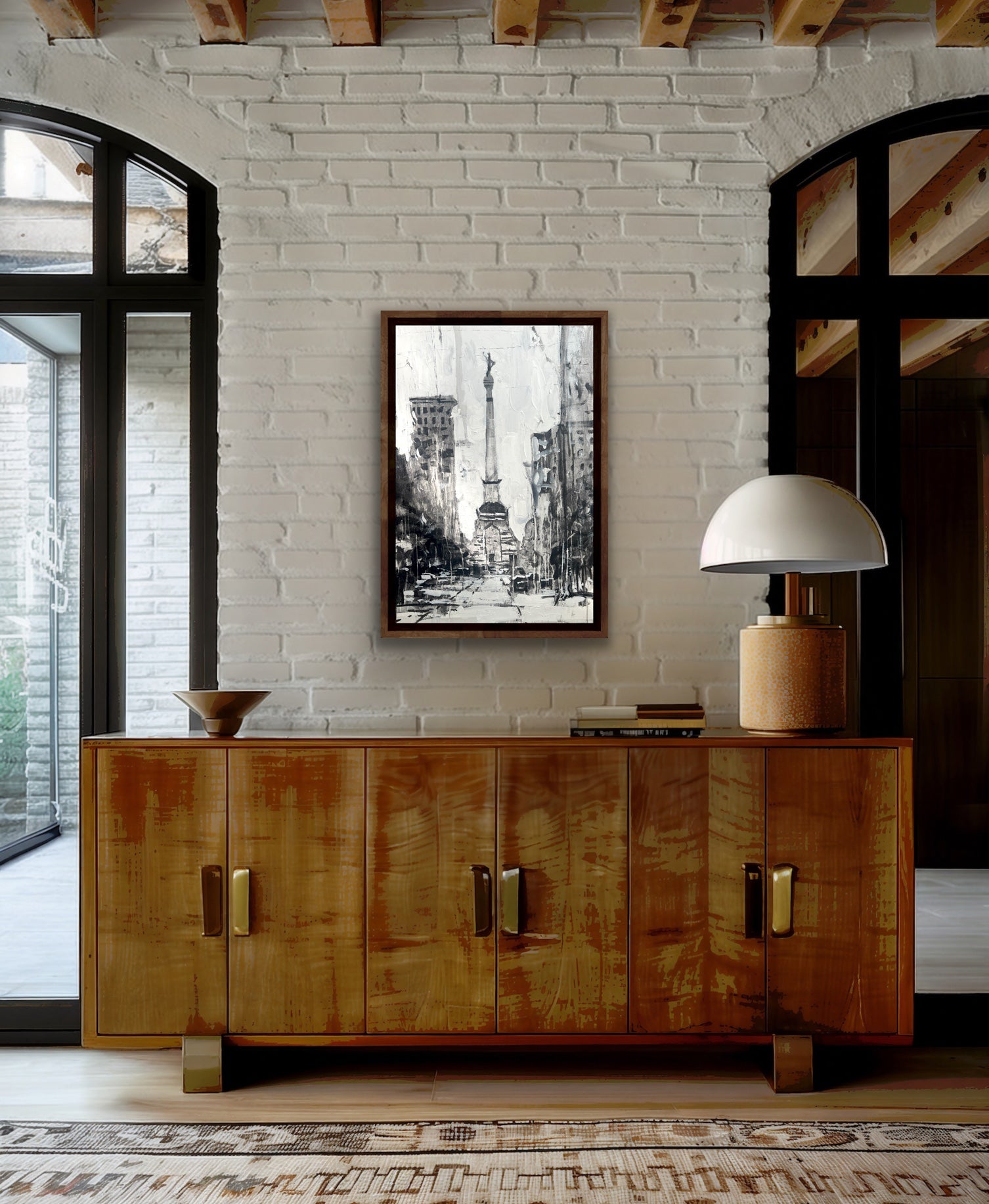 This is an original mixed media painting of an Indianapolis street scene with the monument. This sophisticated cityscape piece, with neutral grays, black and white tones, will enhance any space; great for home or office decorating.